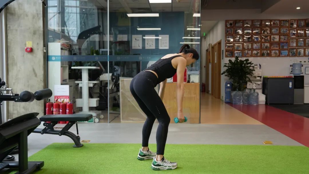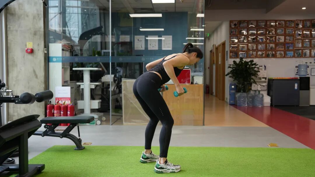 动作要领:腰部略微弯曲,躯干向前倾斜(角度略高于地面平行线,但小于30度);双膝略微弯曲,头部朝前。收缩腰部肌肉并保持这个姿势,直到完成一组;双手各拿一个哑铃,手掌相互平行。