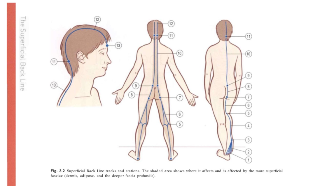 人体有12条筋膜链,分别是后表线、前表线、体侧线、螺旋线、手臂线(浅背臂线、深背臂线、浅前臂线、深前臂线)、功能线(前功能线和背功能线)、前深线,其中后表线连接并保护整个身体的后表面,像一个从脚底到头顶的盔甲,可分为脚趾到膝盖,以及膝盖到额头两部分。