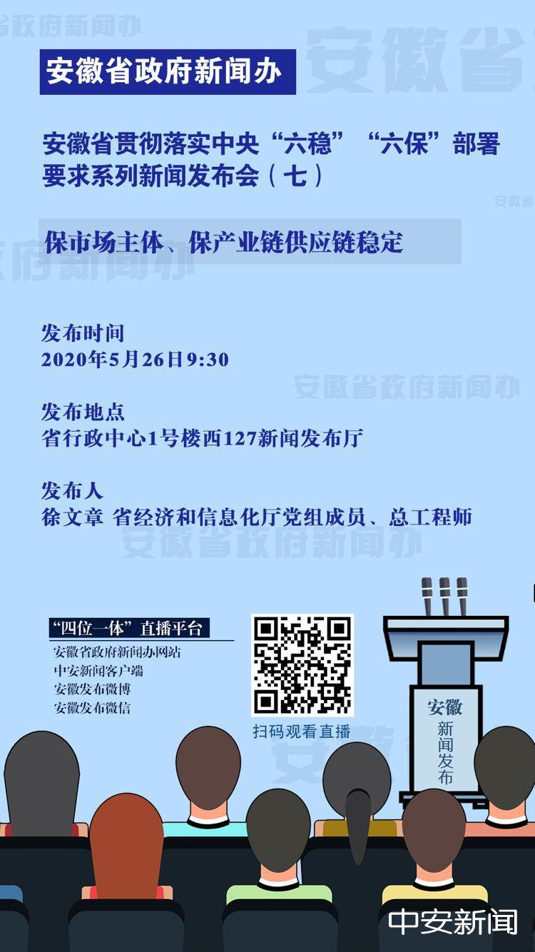 5月26日上午9:30,安徽省贯彻落实中央“六稳”“六保”部署要求系列新闻发布会(第七场)在省行政中心1号楼西127会议室举办,省经济和信息化厅党组成员、总工程师徐文章介绍保市场主体、保产业链供应链稳定工作有关情况,并回答记者提问。敬请关注!
