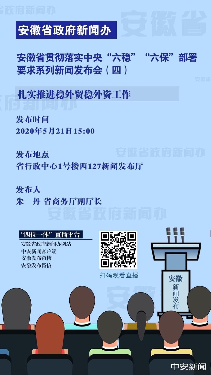 5月21日下午15:00,省政府在省行政中心1号楼(包河区中山路1号)西127会议室举办安徽省贯彻落实中央“六稳”“六保”部署要求系列新闻发布会(第四场),请省商务厅副厅长朱丹介绍我省扎实推进稳外贸稳外资工作情况,并回答记者提问。敬请关注!