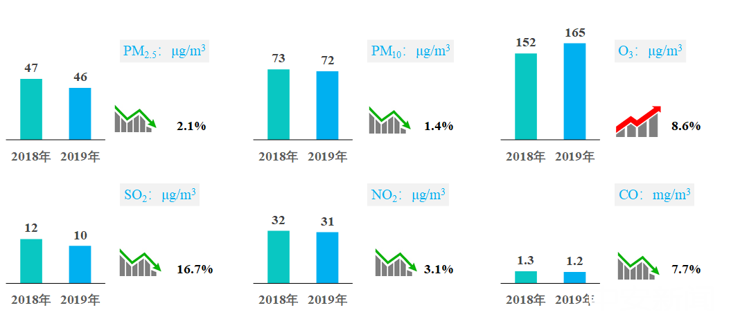 【安徽省生态环境厅厅长徐恒秋】(一)大气环境质量。 1. 城市环境空气。 2019年,全省平均细颗粒物(PM2.5)和可吸入颗粒物(PM10)平均浓度均为有监测记录以来最好水平,二氧化硫(SO2)、二氧化氮(NO2)和一氧化碳(CO)浓度均达到一级标准。其中,全省PM2.5年均浓度为46微克/立方米,同比下降2.1%;PM10年均浓度为72微克/立方米,同比下降1.4%;SO2年均浓度为10微克/立方米,同比下降16.7%;NO2年均浓度为31微克/立方米,同比下降3.1%;CO浓度为1.2毫克/立方米,同比下降7.7%;O3浓度为165微克/立方米,同比上升8.6%。黄山市环境空气质量全面达标,在全国168个重点城市排名中位居第5位。 2019年,全省平均优良天数比例为71.8%;全省16个设区市重度及以上污染天数累计70天,同比下降50.0%。