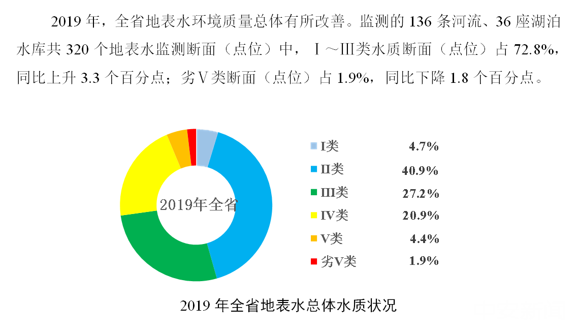 【安徽省生态环境厅厅长徐恒秋】(二)水环境质量。 2019年,全省地表水环境质量总体有所改善。监测的136条河流、36座湖泊水库共320个监测断面(点位)中,Ⅰ—Ⅲ类水质断面(点位)占72.8%,同比上升3.3个百分点;劣Ⅴ类断面(点位)占1.9%,同比下降1.8个百分点。 1. 长江流域。 长江流域总体水质状况由良好转为优。长江干流总体水质状况持续为优,支流总体水质状况为良好。监测的46条支流中,32条水质状况为优、9条为良好、2条为轻度污染、1条为中度污染、2条为重度污染。