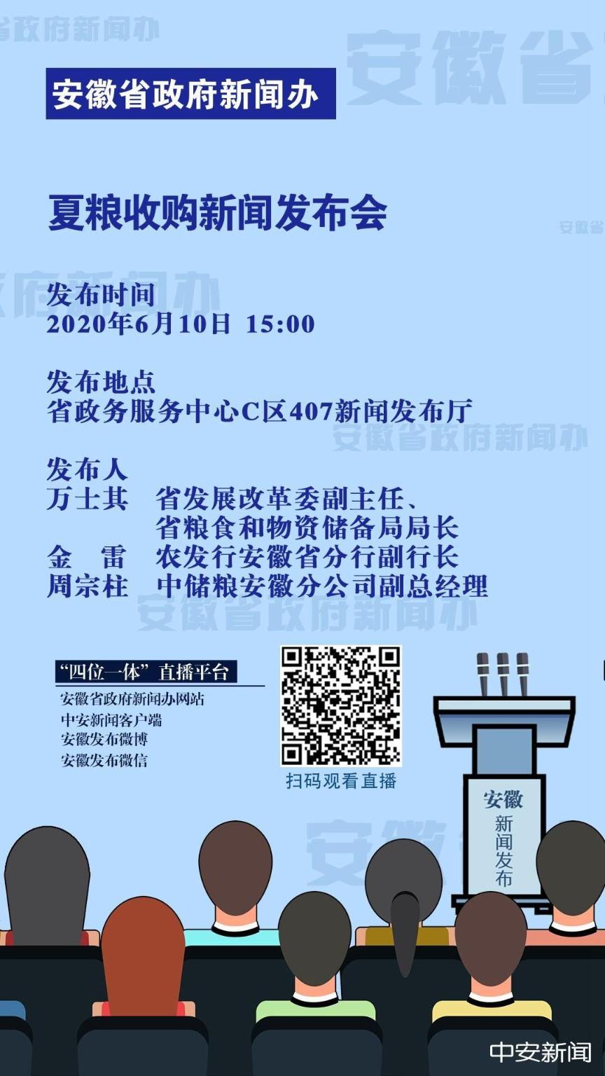 6月10日下午3点,省政府新闻办在省政务服务中心C区407新闻发布厅举办新闻发布会,请省粮食和储备局、农发行安徽省分行、中储粮安徽分公司3家单位,介绍夏粮收购相关情况,并回答记者提问。敬请关注!