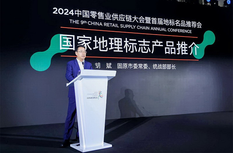 (▲在5月9日上午的“首届地标名品推荐会”现场,固原市委常委、统战部部长、市委农村工作领导小组组长胡斌重点推介了区域公用品牌“源自18℃的夏天——六盘山冷凉蔬菜”。)