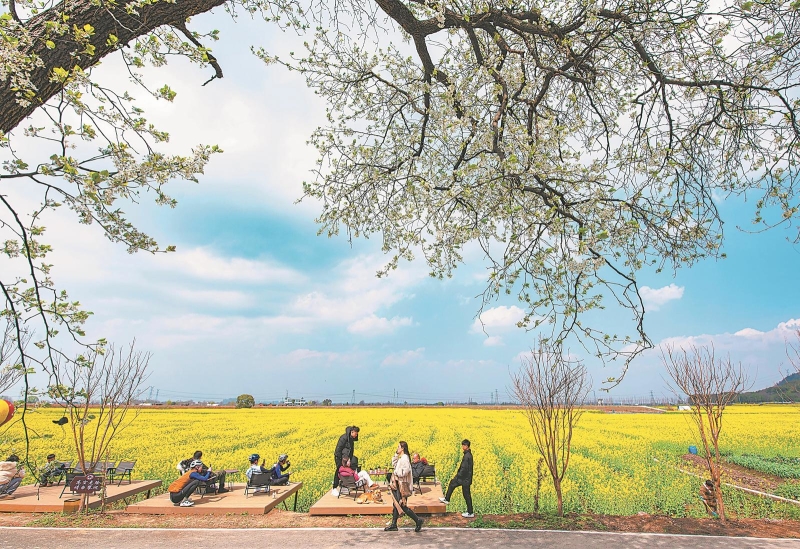 3月16日,芜湖市三山经济开发区峨桥镇响水涧,游客在盛开的油菜花田边拍照赏花。仲春时节,峨桥镇响水涧盛开的油菜花与河流、村庄、麦田、蓝天相映成景,构成一幅色彩斑斓的江南水乡田园画卷。