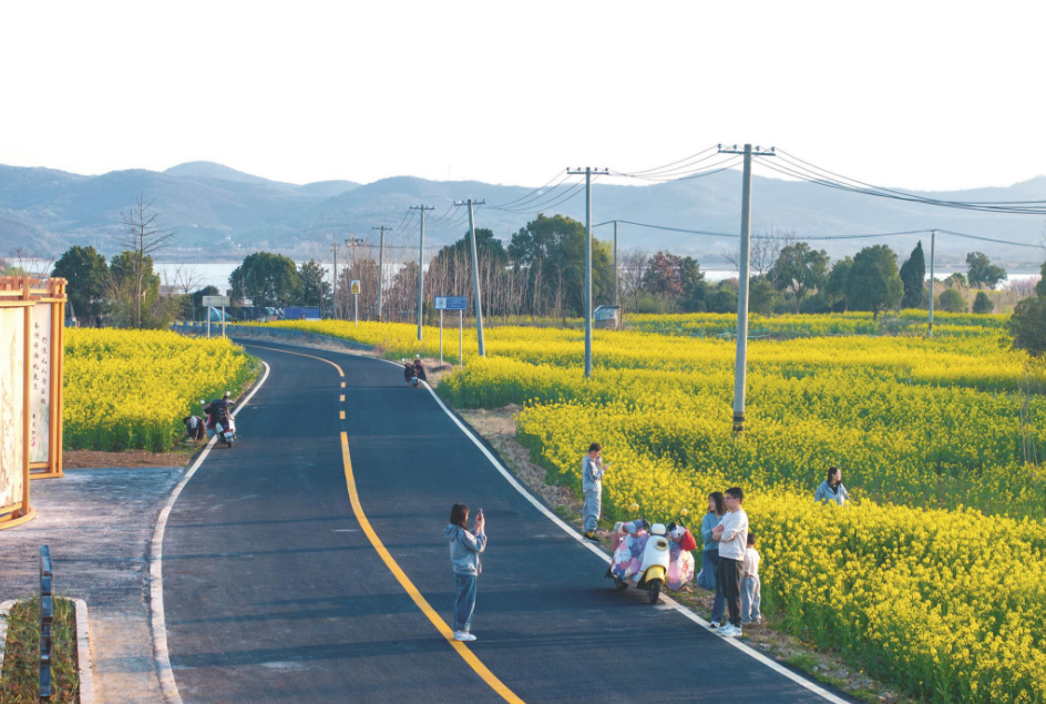 在琅琊风景线环西涧湖路段,市民在欣赏春景,打卡游玩。眼下正是踏青春游好时节,在琅琊风景线环西涧湖路段,春山如笑,水波粼粼,金黄的油菜花、蜿蜒的沥青路组成一幅春光无限的山水田园图景,吸引了众多市民前来游玩打卡,享受春天。全媒体记者 卢志永 摄