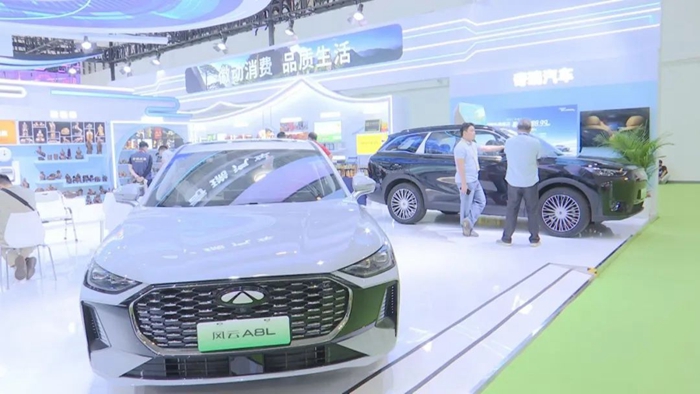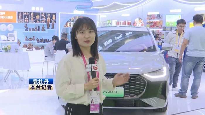 我现在是在第五届消博会的安徽展区,在我身后是由今年首次参展的“重量级选手”奇瑞带来的三款新能源汽车,它搭载了奇瑞最新的全球混动技术,兼具超低能耗与超强动力,向现场观众展示了安徽在新能源汽车制造领域的硬核实力。