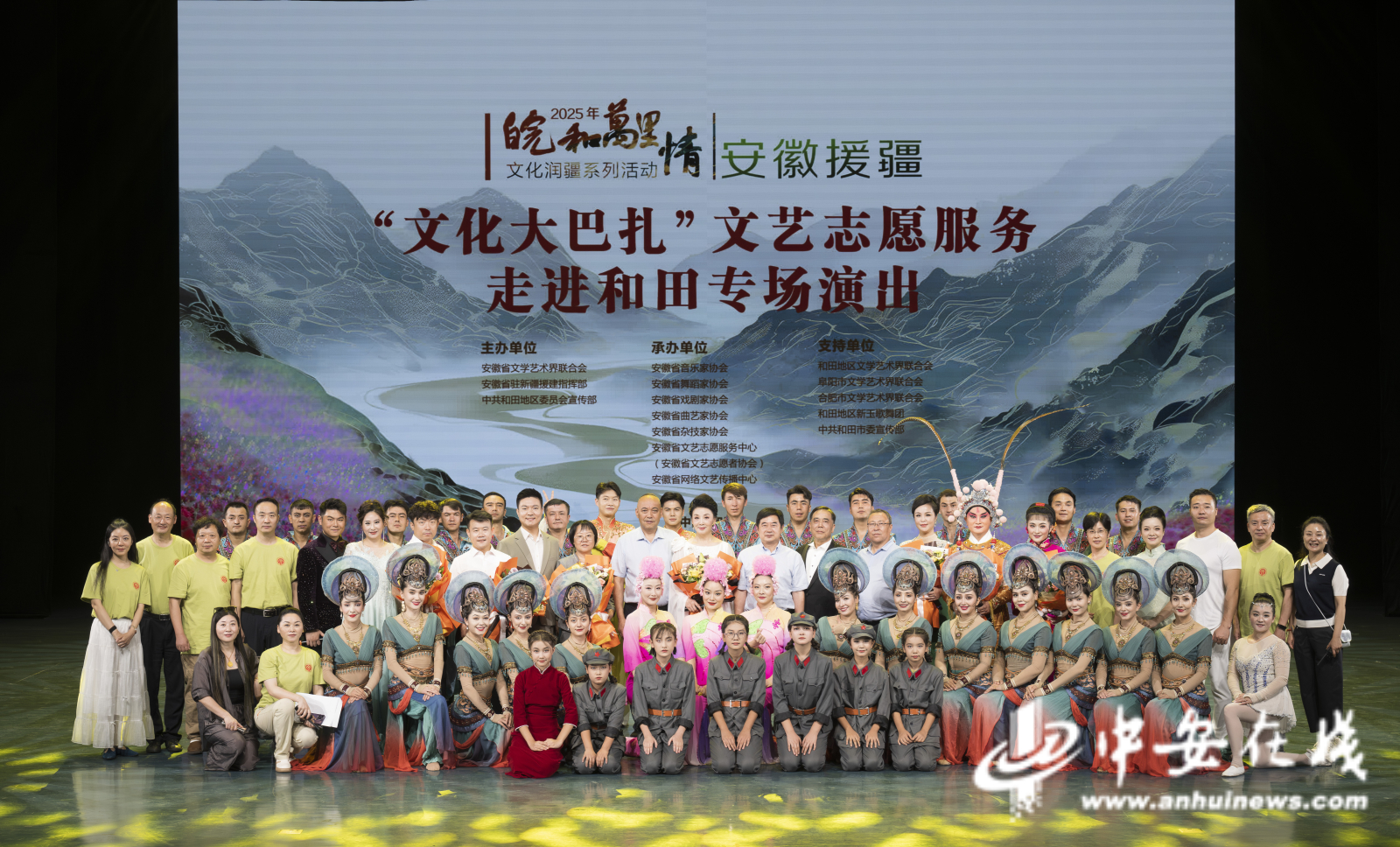 中安在线、中安新闻客户端讯 今年是新疆维吾尔自治区成立70周年,也是安徽省对口支援和田皮山县15周年。为深入学习贯彻习近平文化思想和习近平总书记关于新疆工作重要讲话精神,扎实推进文化润疆工作,8月11日至14日,由安徽省文联、安徽省援疆指挥部、新疆和田地委宣传部主办,安徽省音协、省舞协、省剧协、省曲协、省杂协、省文艺志愿服务中心(省文艺志愿者协会)和省网络文艺传播中心承办的“皖和万里情”文化润疆系列活动走进新疆和田地区,带着安徽人民的深情厚谊,为当地各族群众献上精彩纷呈的文化大餐,搭建起安徽与新疆交流交融的桥梁,深化“中华民族一家亲”认知,铸牢中华民族共同体意识。