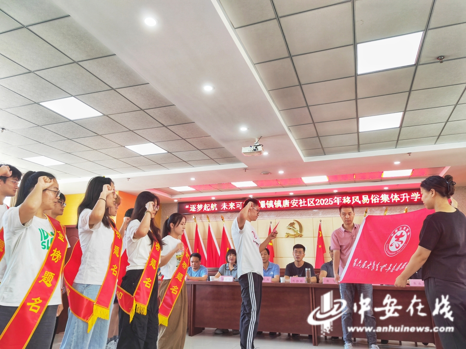 中安在线、中安新闻客户端讯 8月14日,安徽省肥东县劳模(工匠)爱心志愿服务队联合撮镇镇唐安社区,举办了一场主题为“逐梦起航 未来可期”的集体升学礼文明实践活动。活动为17名即将迈入大学校门的准大学生赠送了书包、水杯及行李箱等实用物品。仪式上,学生代表向父母敬献鲜花表达感恩之情,并在倡议书上郑重签名,承诺以实际行动抵制铺张浪费,共同弘扬文明节俭新风尚。(许庆勇 王雪 记者 刘玉才)