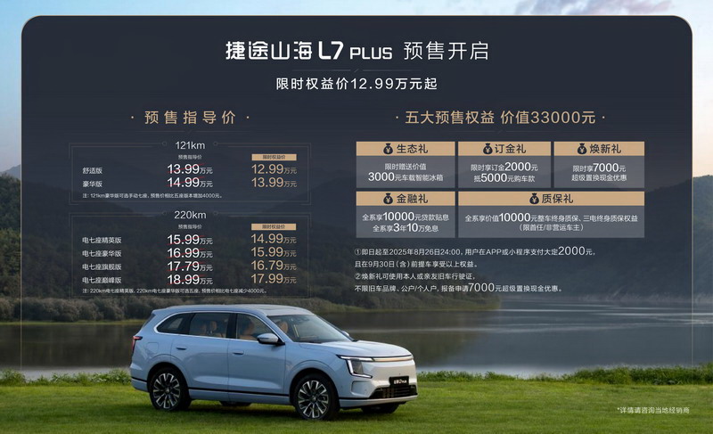 捷途山海L7 PLUS在限时权益价的基础上,还推出了五重购车预售权益,如赠送价值3000元车载智能冰箱、限时享订金2000元抵5000元、7000元置换优惠、10000元贷款贴息、整车终身质保等,为用户带来超越期待的购车体验。