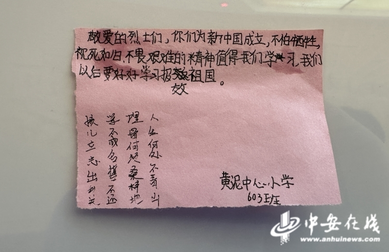 在出口处的留言墙上,许多孩子用稚嫩的笔迹书写了对先烈的敬仰之情。其中来自黄泥中心小学603班的学生是这样写的,“敬爱的烈士们,你们为新中国成立,不怕牺牲,视死如归,不畏艰难的精神值得我们学习。我们以后要好好学习,报效祖国。” (记者 苏艺 刘职伟)