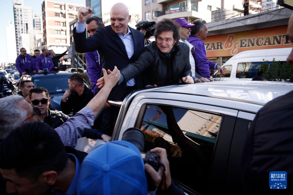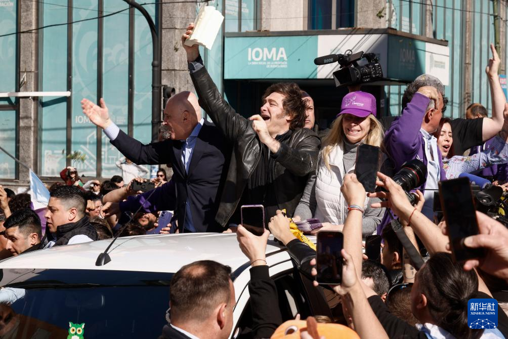8月27日,在阿根廷洛马斯德萨莫拉市,阿根廷总统米莱(中)参加助选活动。新华社发