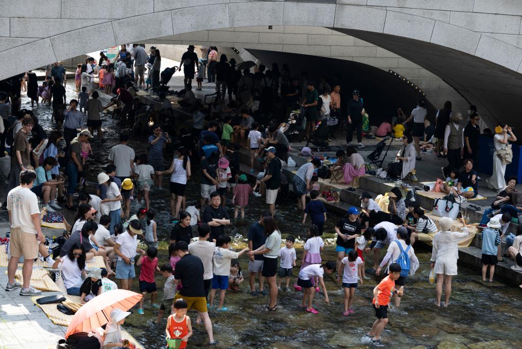 6月14日,人们在韩国首尔的清溪川戏水。新华社发(全休相摄)