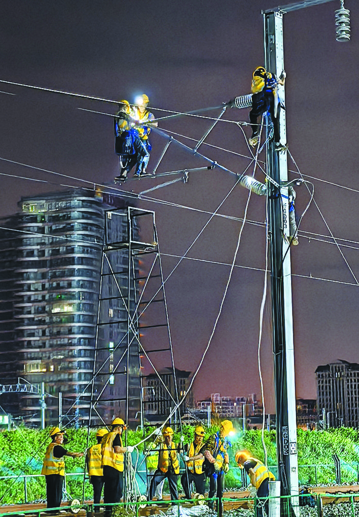 记者在现场看到,有的爬上6米高的接触网,有的负责推车梯,紧张忙碌地在轨道上奔波,在复杂的接触网设备和高空上下穿梭,争分夺秒。