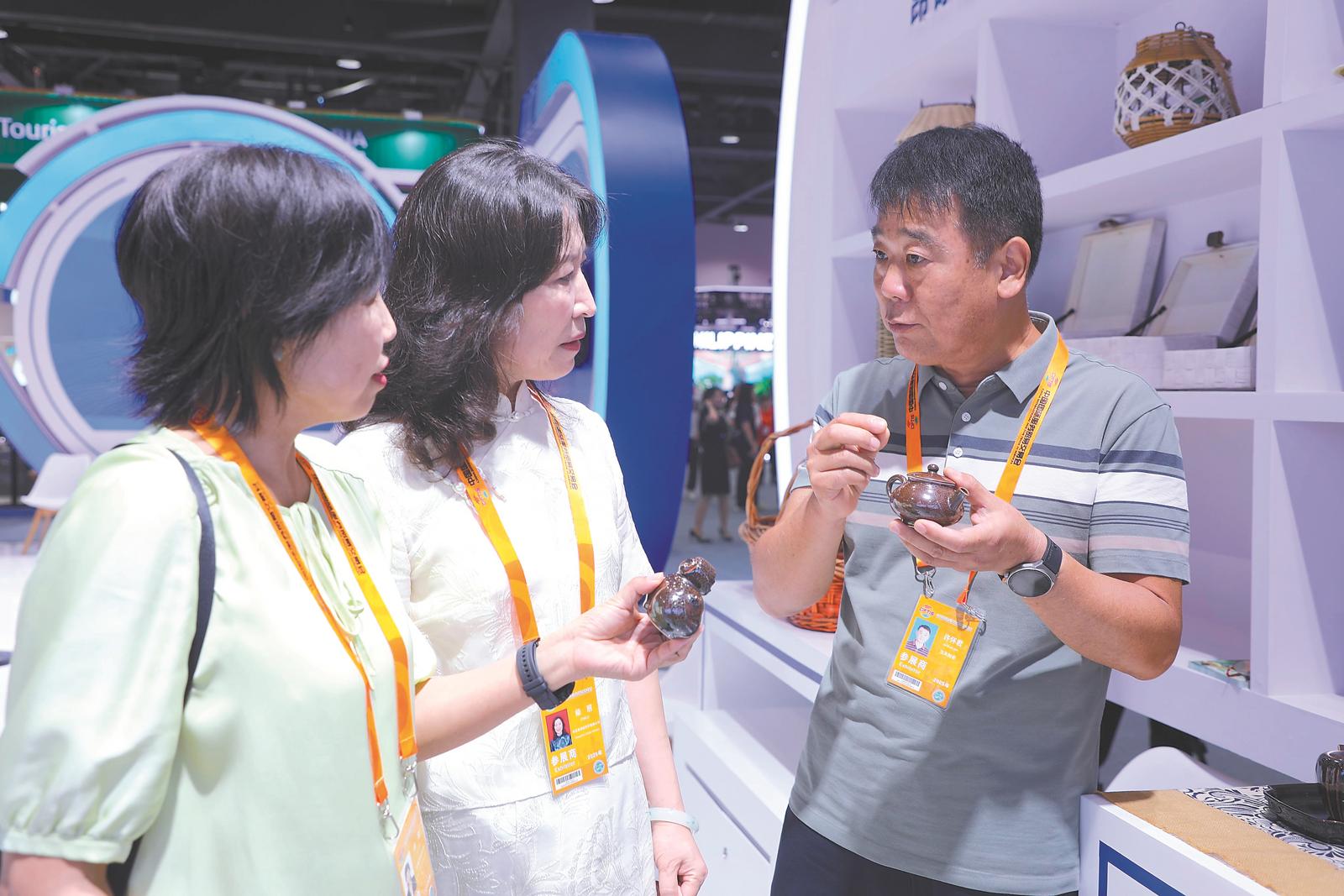参展商(右一)在向游客介绍寿州窑。记者 罗广心 摄