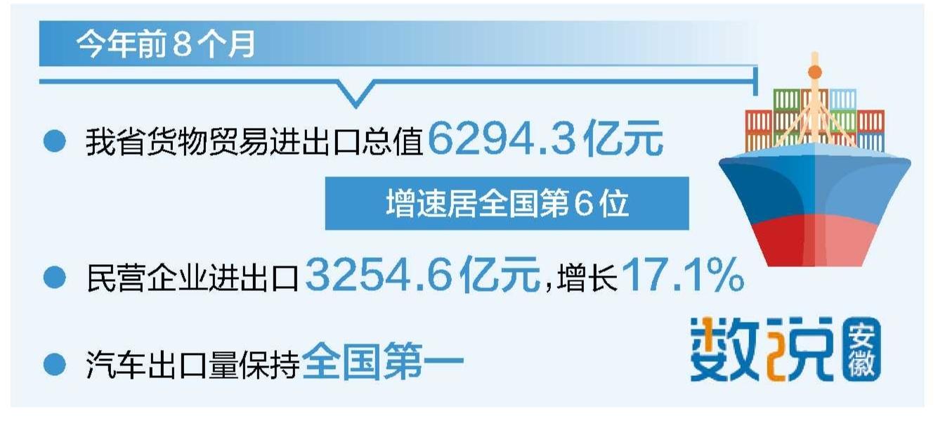 9月10日,记者从合肥海关获悉,今年前8个月,我省货物贸易进出口总值6294.3亿元,同比增长13.8%。从排位上看,进出口总值分别居中部第1位、全国第9位,增速居全国第6位,长三角第1位。