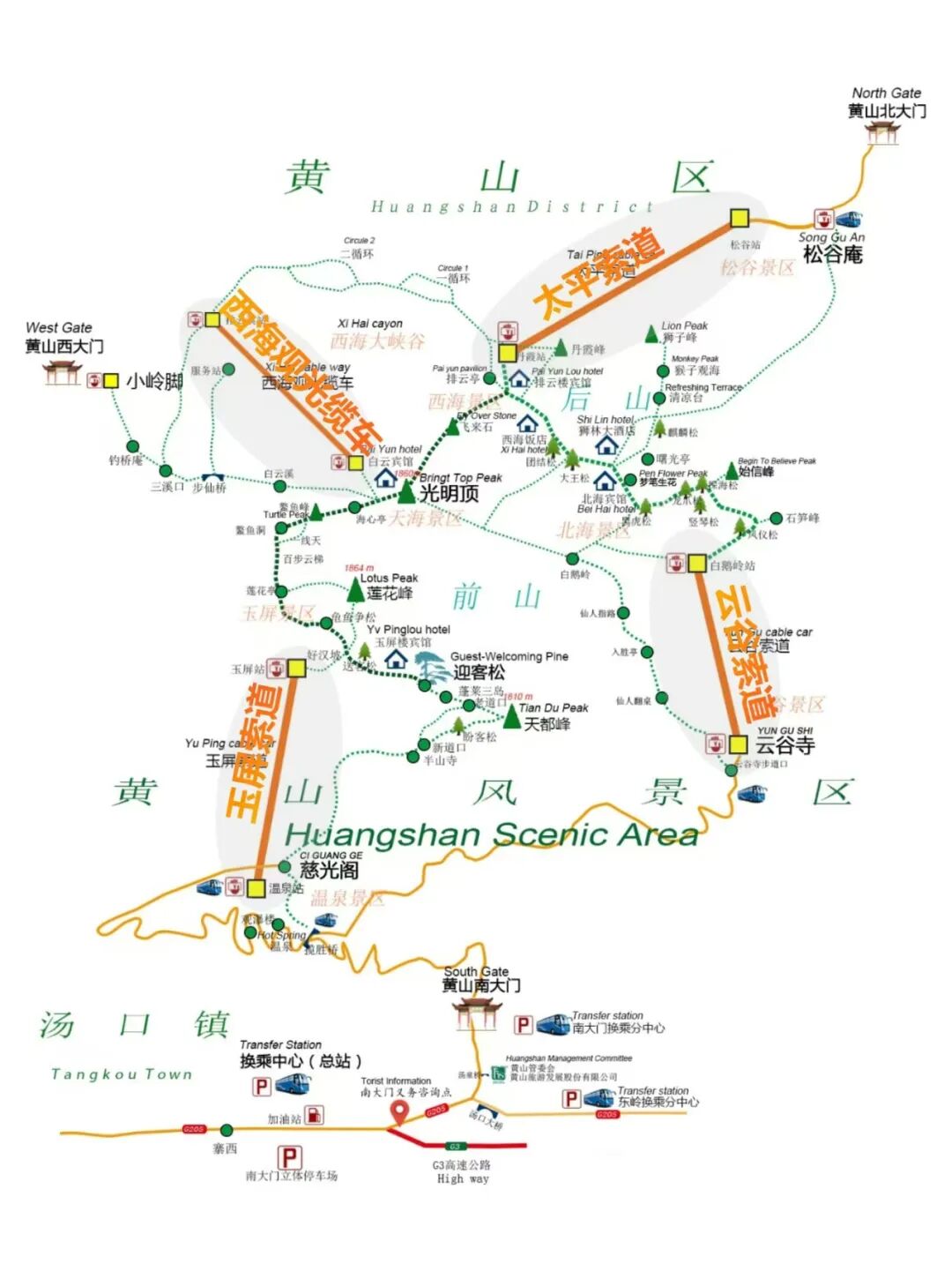 黄山南大门→云谷寺景观区→云谷索道上行→始信峰景观区→狮子峰景观区(清凉台、散花坞)→排云亭景观区→天海景观区→光明顶→北海中路→云谷索道下行→云谷寺景观区→黄山南大门