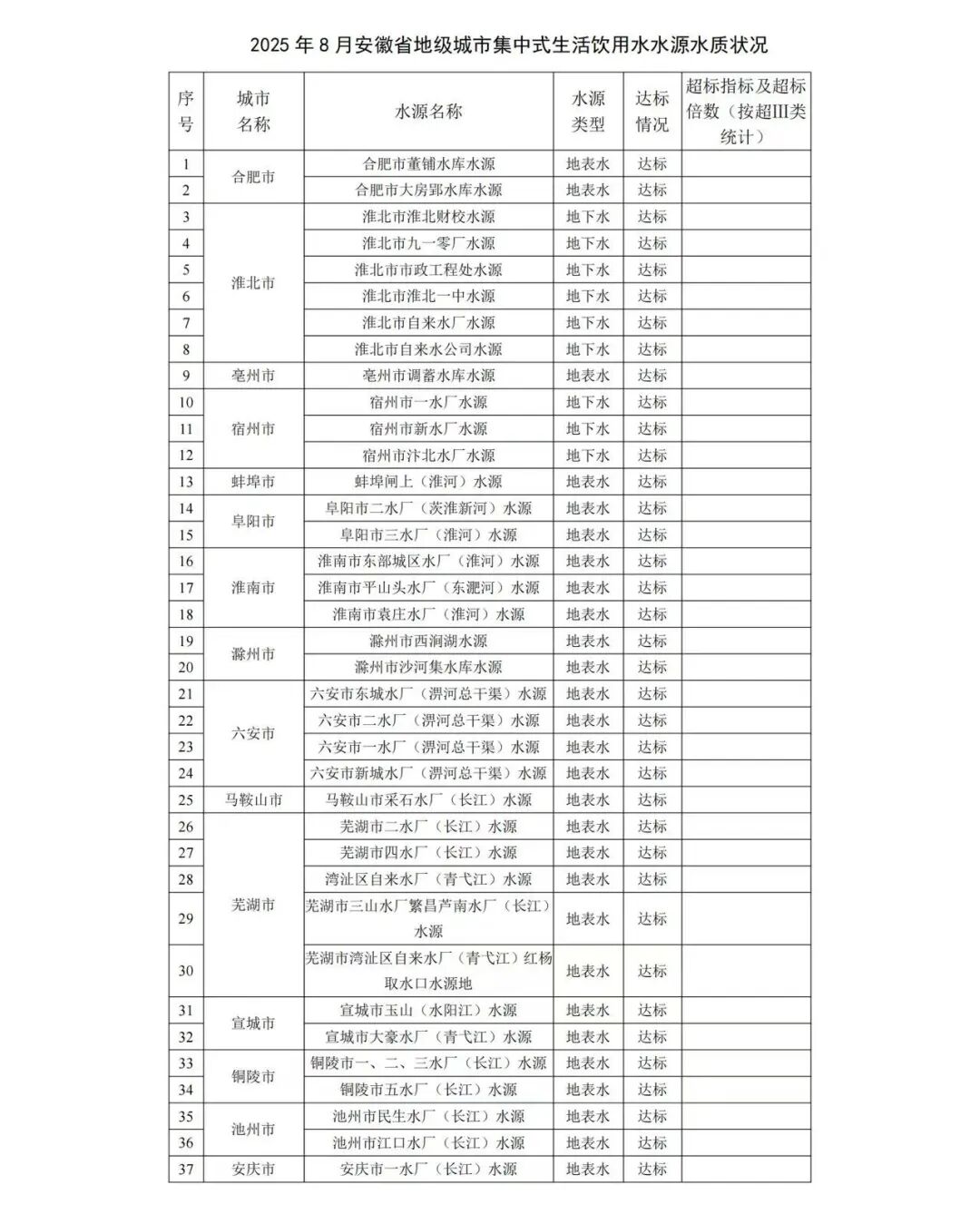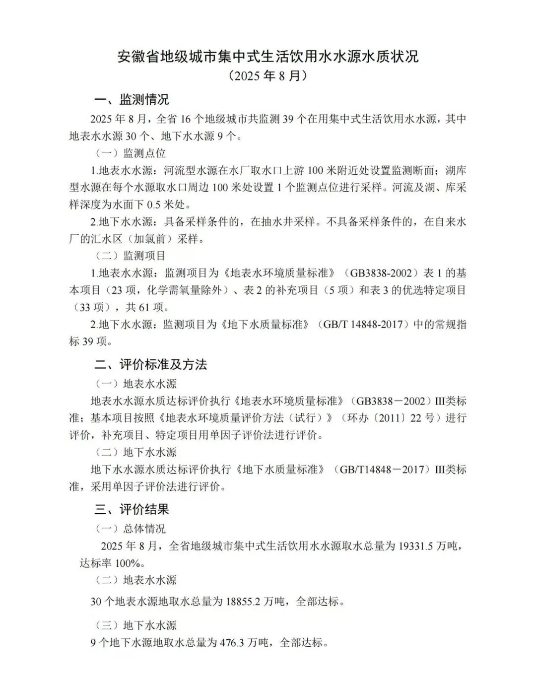 8月份全省地级市集中式生活饮用水水源水质达标率100%