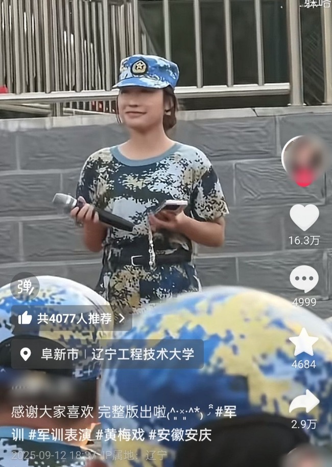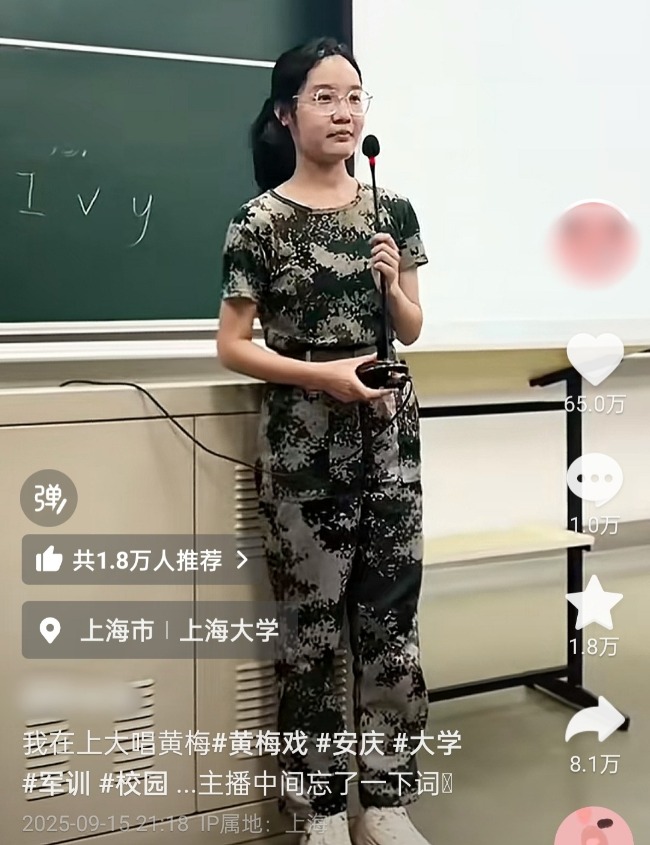 9月15日,另外一名安庆女生也在社交平台发布了自己在上海大学军训时唱黄梅戏的视频,同样走红,点赞量超65万。
