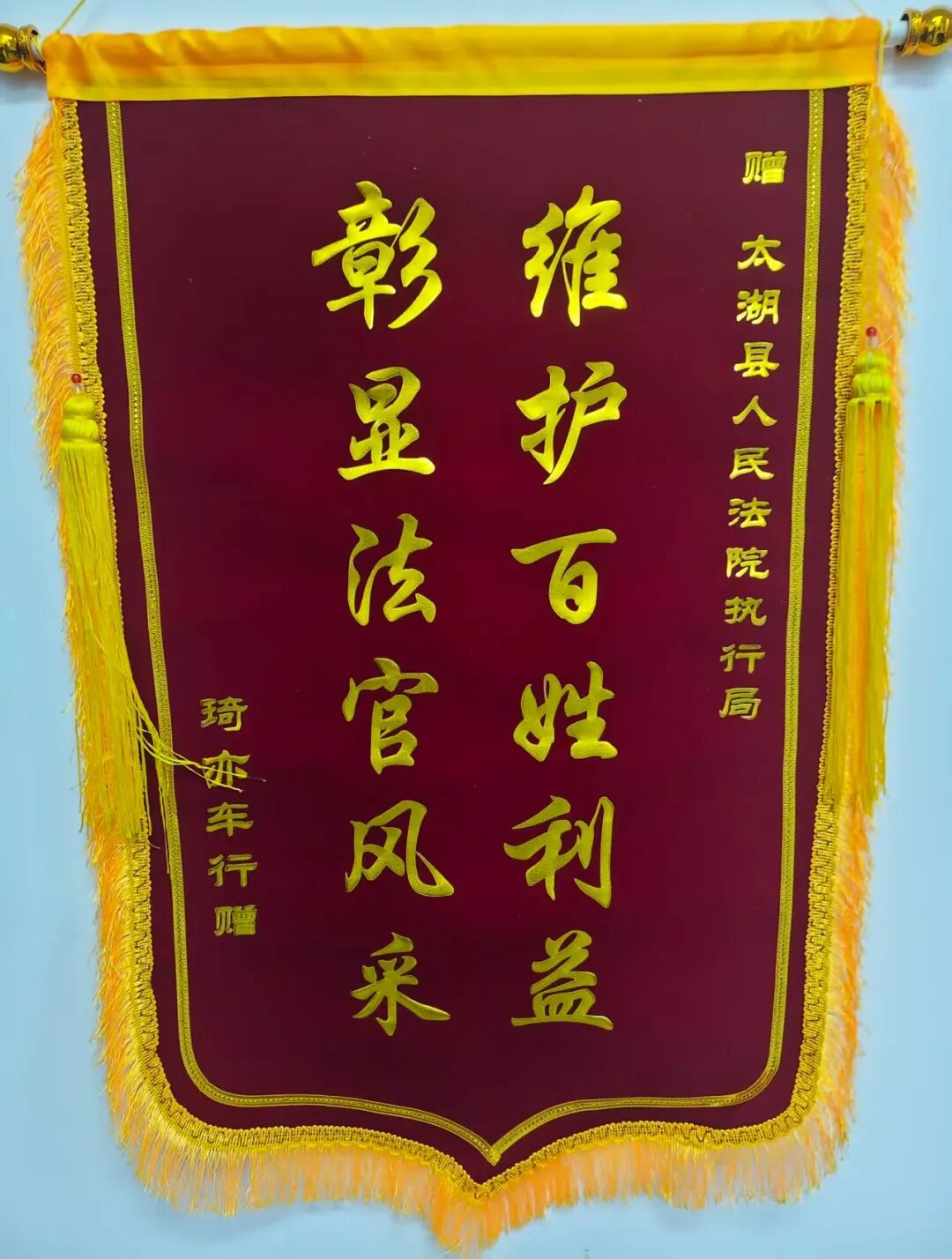 近日,太湖法院执行局执行法官收到一面来自申请执行人送来的印有“维护百姓利益 彰显法官风采”的锦旗。
