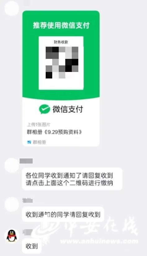 9月29日,合肥市公安局经开分局接到辖区某学校,多名学生报案称,有人冒充英语老师,在班级QQ群内发布通知,以购买学习资料为名,要求每位学生缴纳99元费用,并直接将收款码发到了群里。