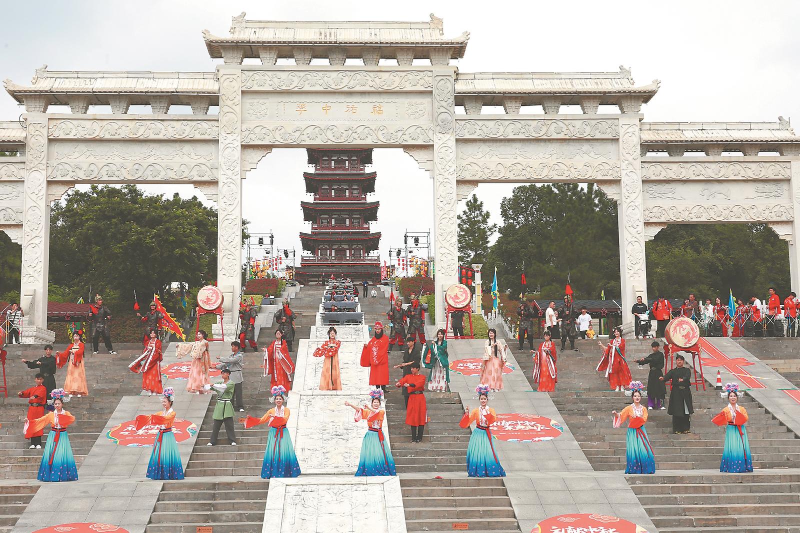 白天的钟馗文化园,游客自三界桥下,伴随《钟馗赴考》的悠悠船歌,不知不觉就“走进”了盛唐的情境里。沿主台阶往上走,神武门前早已围满了人,《钟馗纳福》情景剧正在上演。转过拐角,一阵锣鼓声传来,《钟馗嫁妹》巡游队伍迎面走来,演员们边走边与游客互动。有的游客跟着队伍一起哼唱巡游小调,有的还伸手与“钟馗”击掌,原本安静的园区变成了热闹的“盛唐街市”。