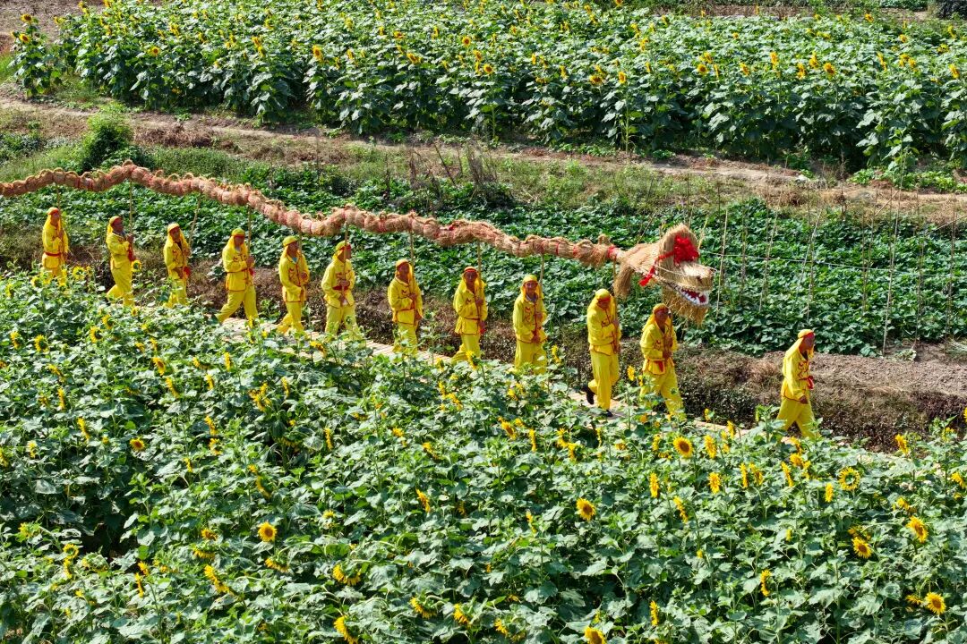 10月4日,在徽州区蜀源村的向日葵花海里,村民舞动草龙庆祝丰收。蜀源“舞草龙”距今已有300多年的历史,每逢“舞草龙”,各家各户都会自发将稻草集中起来,用于草龙的制作,寓意新的一年取得好收成。“舞草龙”祈丰年的老习俗,如今成了“文化+旅游”的新亮点,为文旅消费注入活力。·樊成柱·