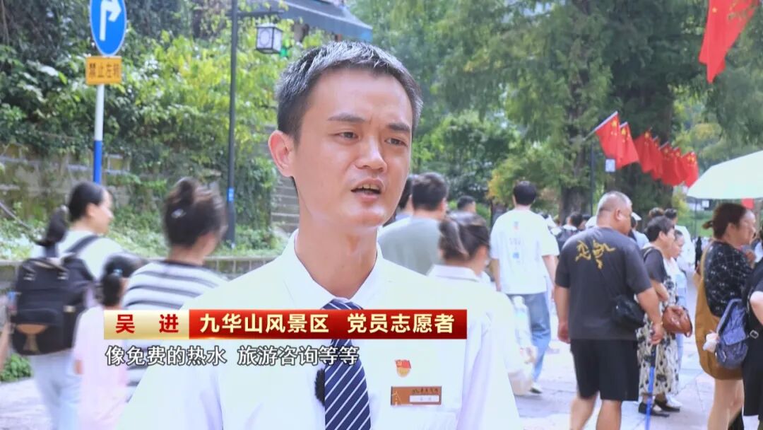 国庆中秋假期里,九华山、天柱山等景区均在游客往来密集区域,设置了志愿服务点,每天安排上百人次参与志愿服务,为进山游客提供旅游咨询、交通引导等暖心服务。