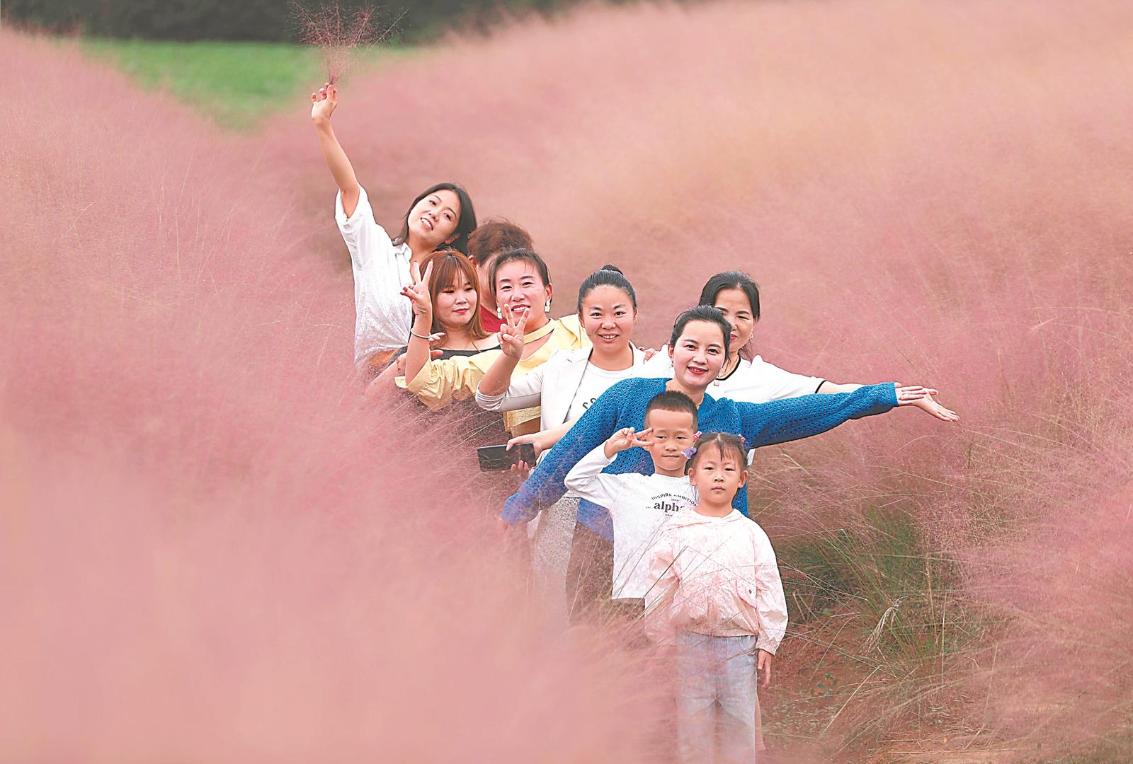 10月11日,庐江县汤池镇粉黛西坡大片的粉黛乱子草吸引众多游客徜徉。通讯员 解光文 摄