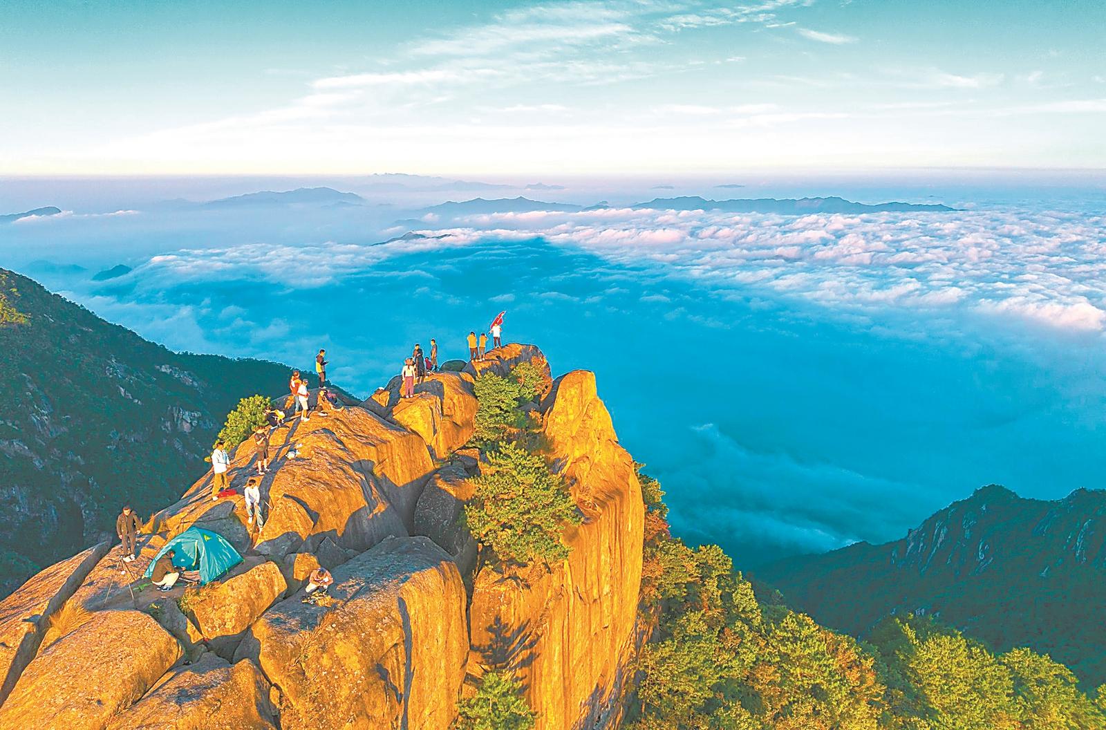 近日,游客在绩溪县省道S346山云岭段附近观赏日出云海景观。通讯员 程年生 周斯跃 摄