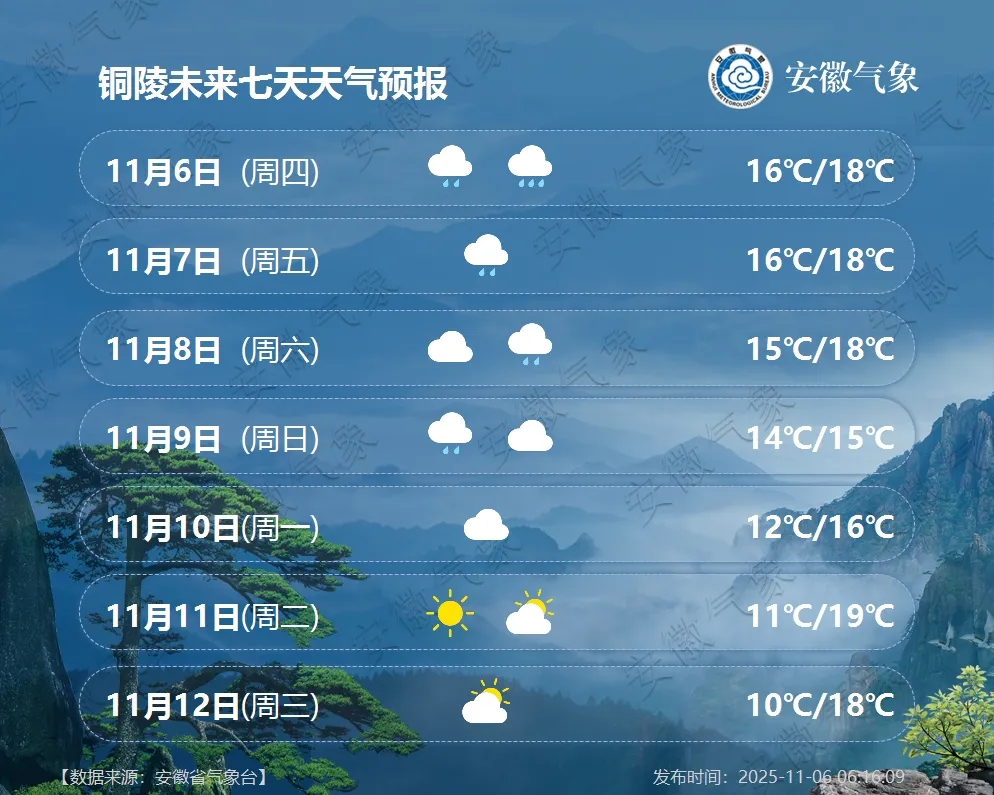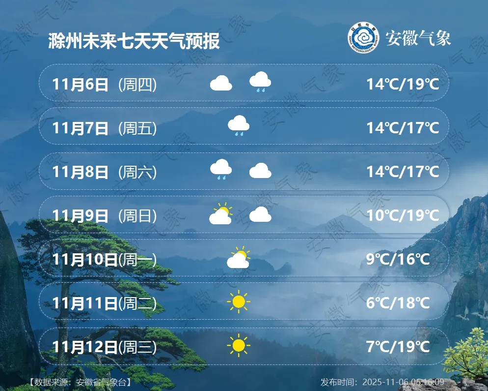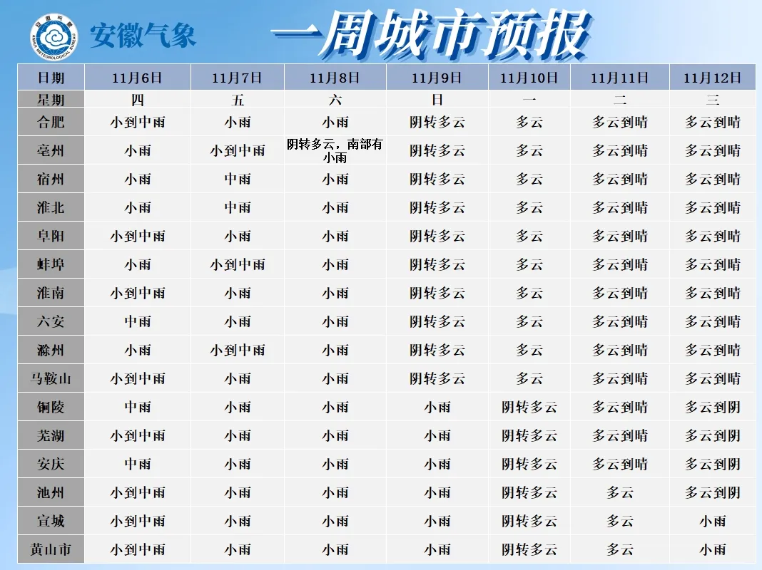 7日(周五):全省阴天。江北有小雨,其中淮河以北大部分地区和江淮之间东部部分地区有中雨;江南大部分地区有小雨。