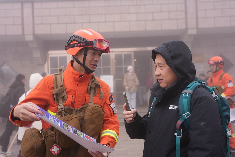 “您知道森林防火报警电话吗?”在一处观景平台,消防员停下脚步,向游客递上宣传单。“是12119。请您一定牢记,守护这片青山,需要我们共同努力。”