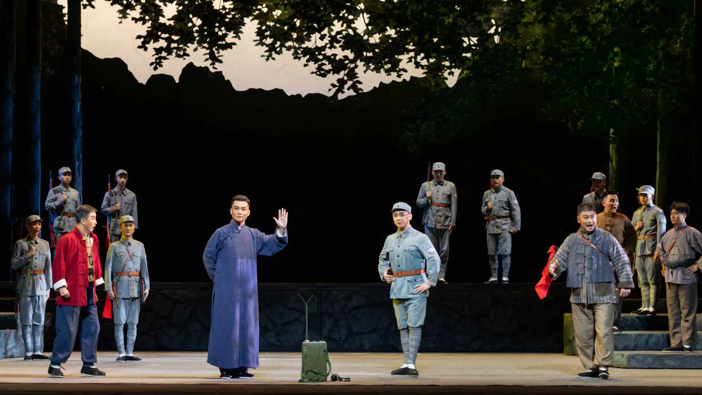 虞文兵的表演更是将传统韵味与现代审美相融合。他饰演的新四军指挥员,既有传统戏曲程式化的身段美感——一个亮相、一个转身,皆是戏曲韵味;又有话剧般细腻真实的情绪传递——眼神中的坚定,语气里的温度,让英雄不再是符号,而是有血有肉的人。