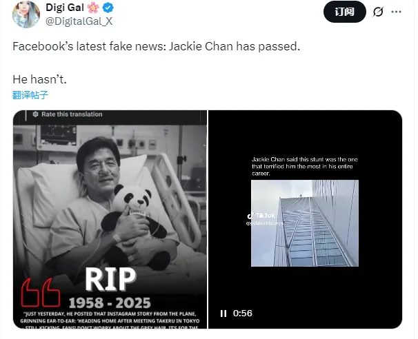 网友@DigitalGal_ 通过截图辟谣强调:“脸书最新假新闻:成龙去世。纯属虚构。”