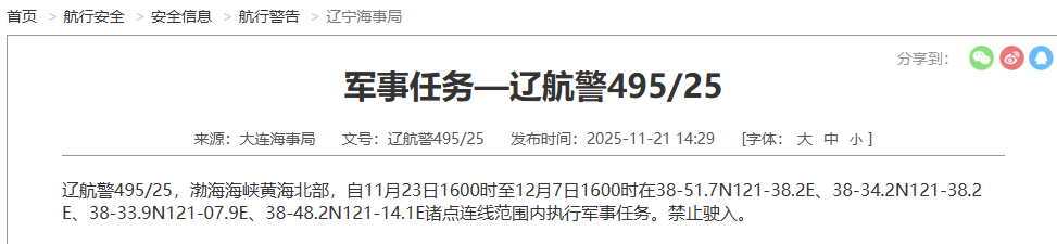 辽航警495/25,渤海海峡黄海北部,自11月23日16:00时至12月7日16:00时在38-51.7N121-38.2E、38-34.2N121-38.2E、38-33.9N121-07.9E、38-48.2N121-14.1E诸点连线范围内执行军事任务。禁止驶入。