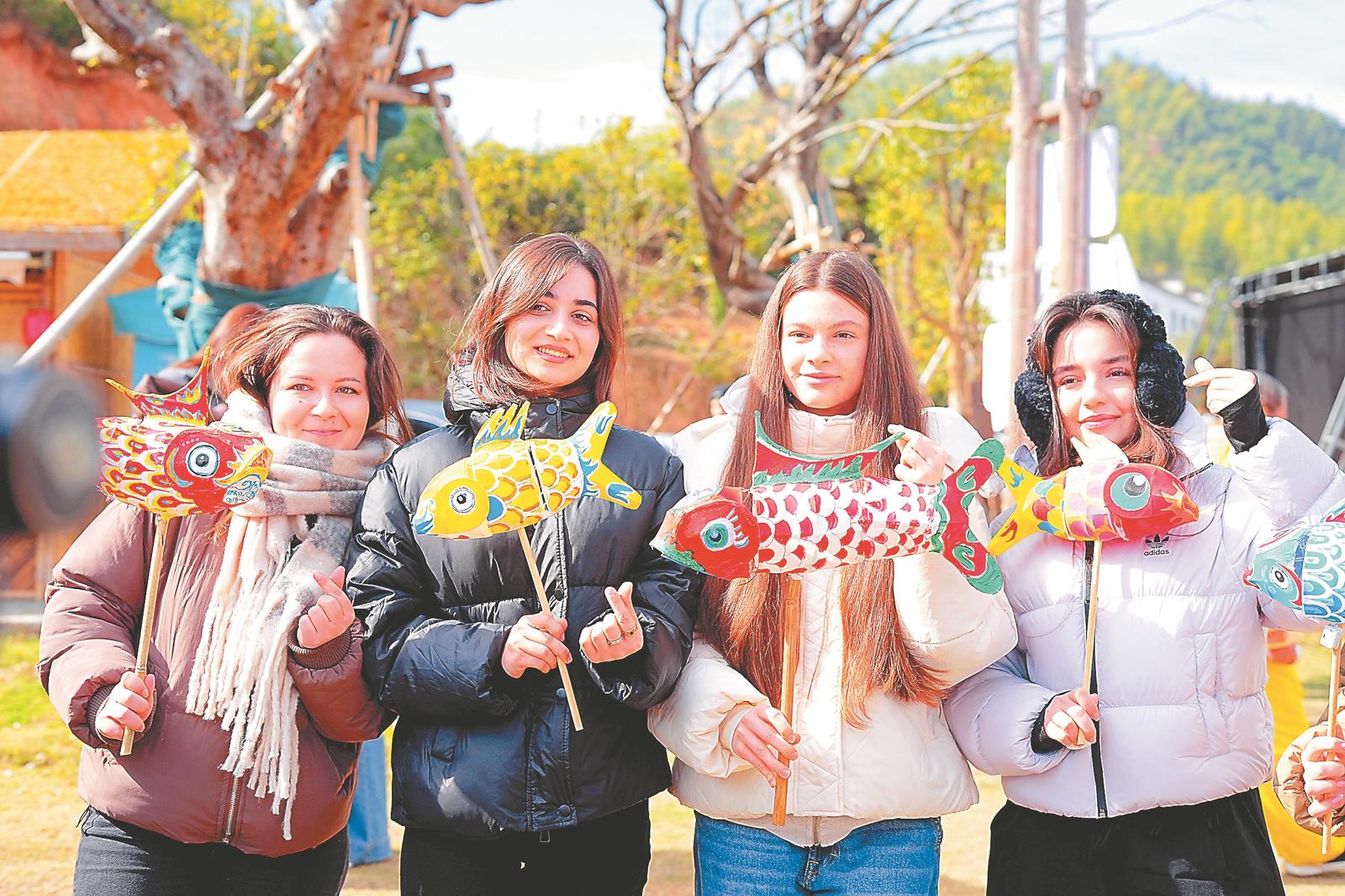 外国游客体验徽州鱼灯。徽州区文旅体局供图