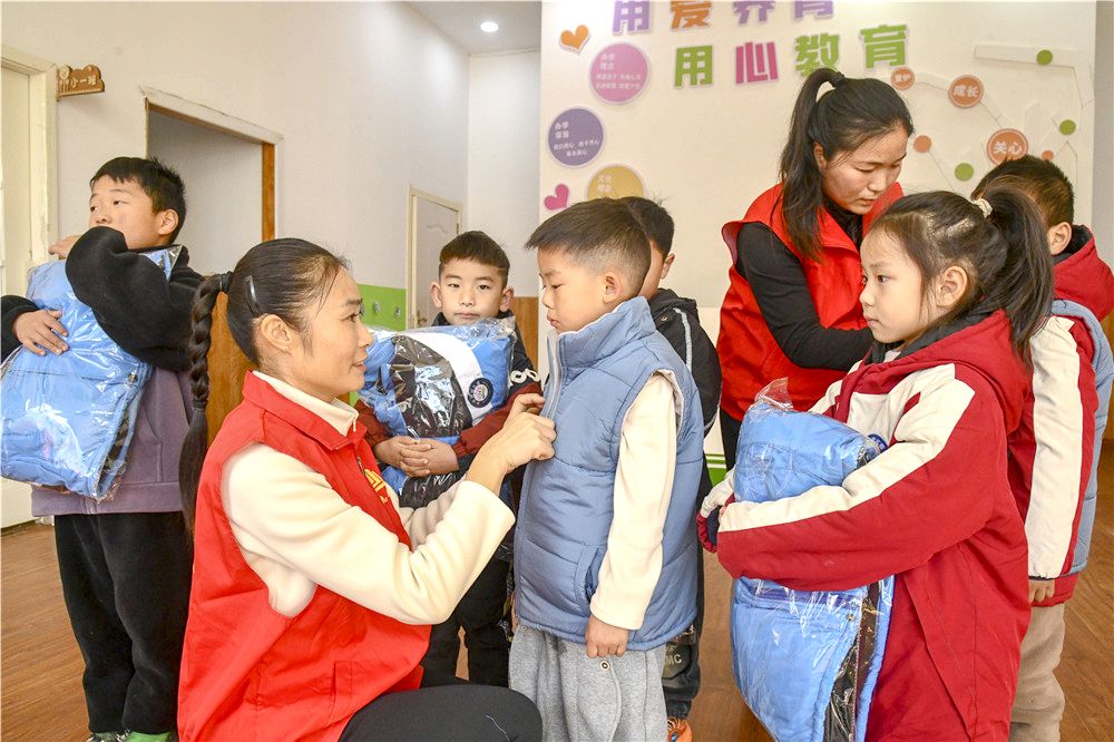 11月26日,在谯城区农贸城幼儿园,爱心志愿者为家庭困难儿童送上羽绒服等生活用品。入冬以来,谯城区贝贝乐工会驿站联合谯城区汤陵街道汤陵社区组织开展“冬日暖阳,爱暖童心”志愿服务活动,爱心志愿者为家庭困难的儿童送上棉衣、棉帽、棉手套等生活用品,让孩子们度过一个温暖而又充满爱心的冬天。张刘艳 摄
