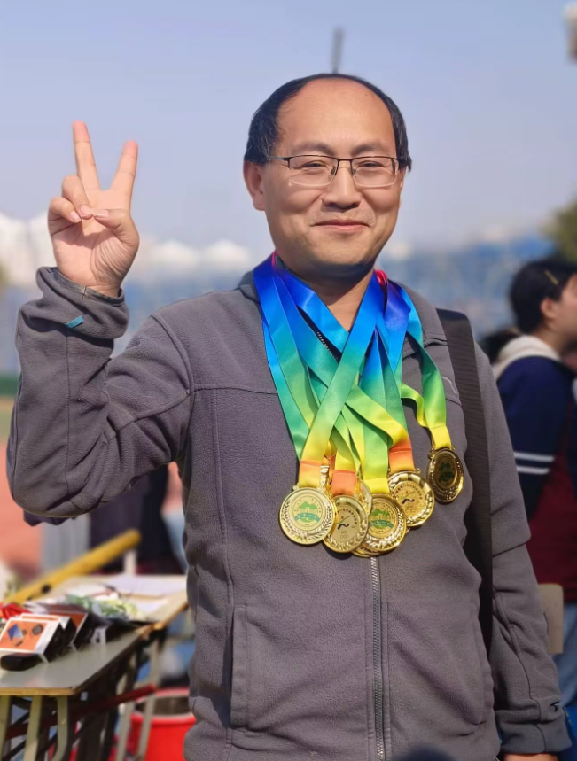 运动会上,学生获奖后将奖牌戴在刘松老师胸前