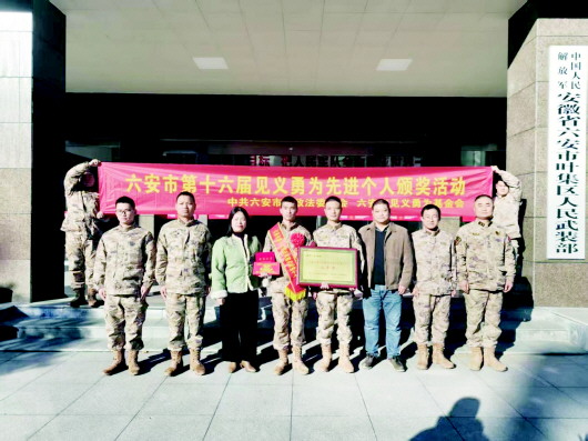 叶集讯(台德丽 文/图)近日,叶集区委政法委受六安市委政法委委托,联合区见义勇为基金会前往区人武部,为荣获“六安市第十六届见义勇为先进个人”称号的区人武部教练员张鸿锐开展上门送奖活动,表彰他在危急时刻挺身而出、奋不顾身的英勇壮举,向他致以崇高的荣誉与诚挚的慰问。