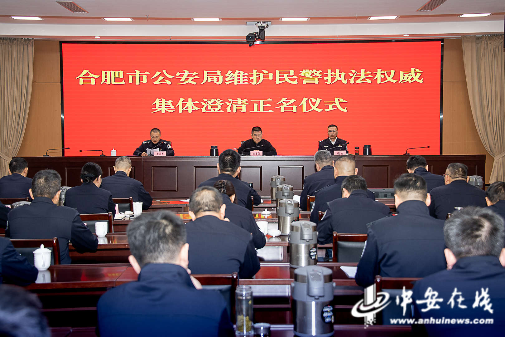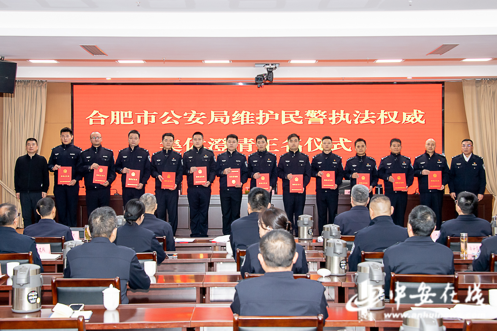 12月4日上午,合肥市公安局举办维护民警执法权威集体正名仪式,为12名在依法履职中遭受恶意、不实投诉的民警澄清正名。
