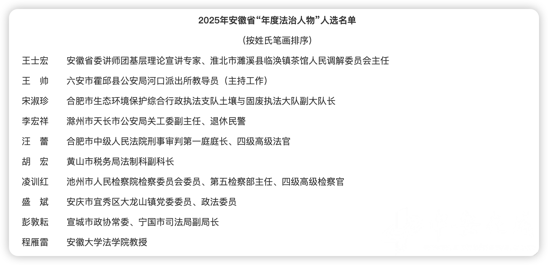 中安在线、中安新闻客户端讯 为深入贯彻落实习近平法治思想和党的二十届四中全会精神,大力宣传法治安徽建设进程中涌现出的先进典型,近日,由省委依法治省办、省司法厅联合举办,以“弘扬宪法精神建设法治安徽”为主题的2025年安徽省“年度法治人物”宣传选树活动结果揭晓。