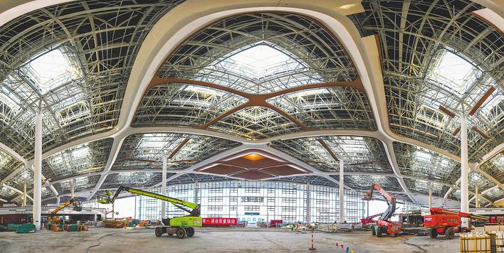 合肥新桥机场二期工程T2航站楼建设进展顺利,主体结构、钢结构屋盖、二次结构已全部完成,金属屋面、幕墙工程进入收尾阶段,登机桥施工稳步推进,机电设备安装及管线铺设完成过半,非公共区装修全面展开,公共区精装修样板段施工及基层处理正在加紧进行,预计2026年6月竣工。(通讯员 王世保 摄)