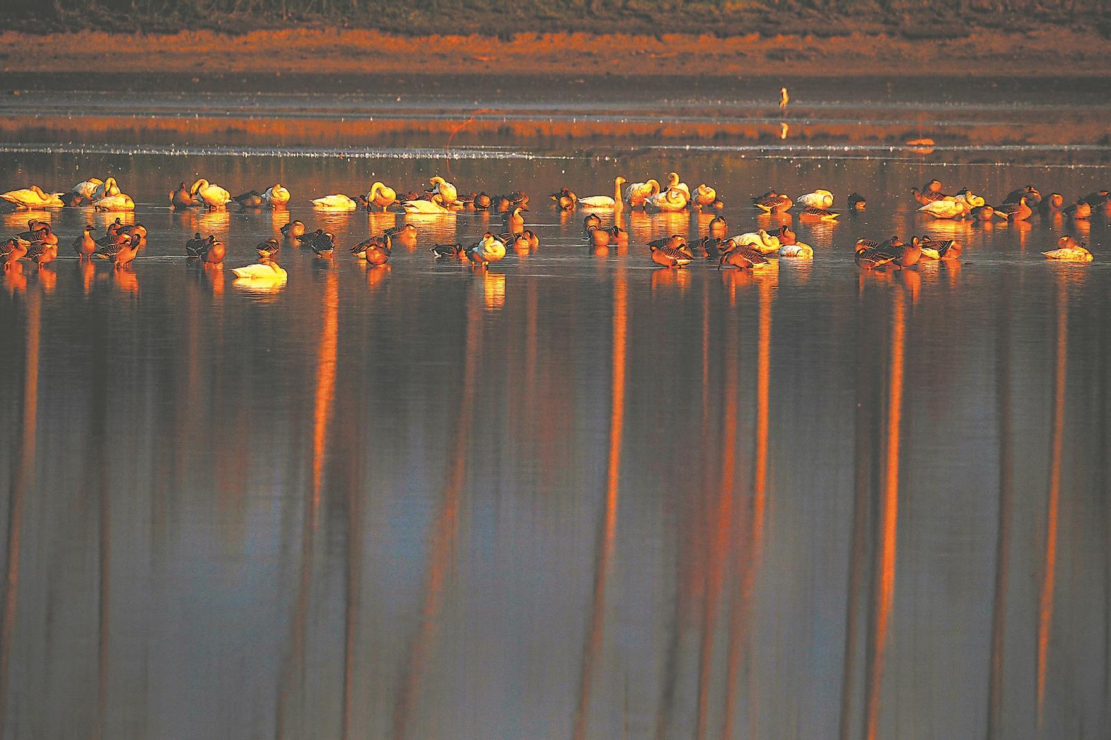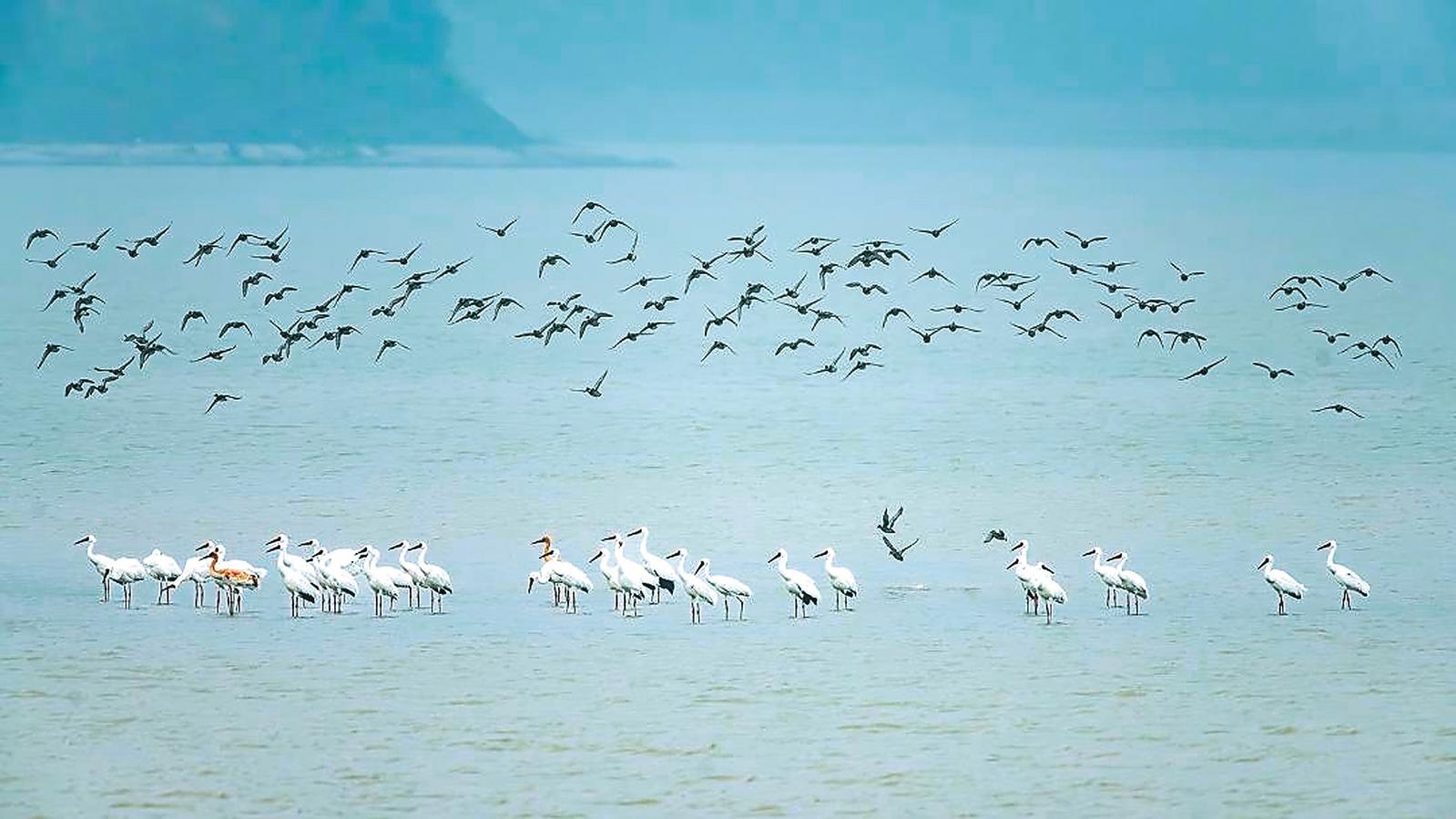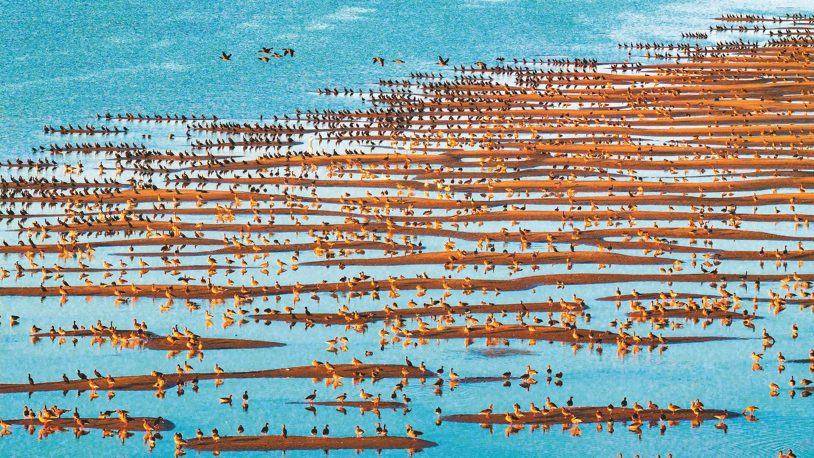 11月22日,长江安徽东流段稠林矶江滩,成群候鸟在水中休憩,勾勒出一幅灵动唯美的生态画卷。