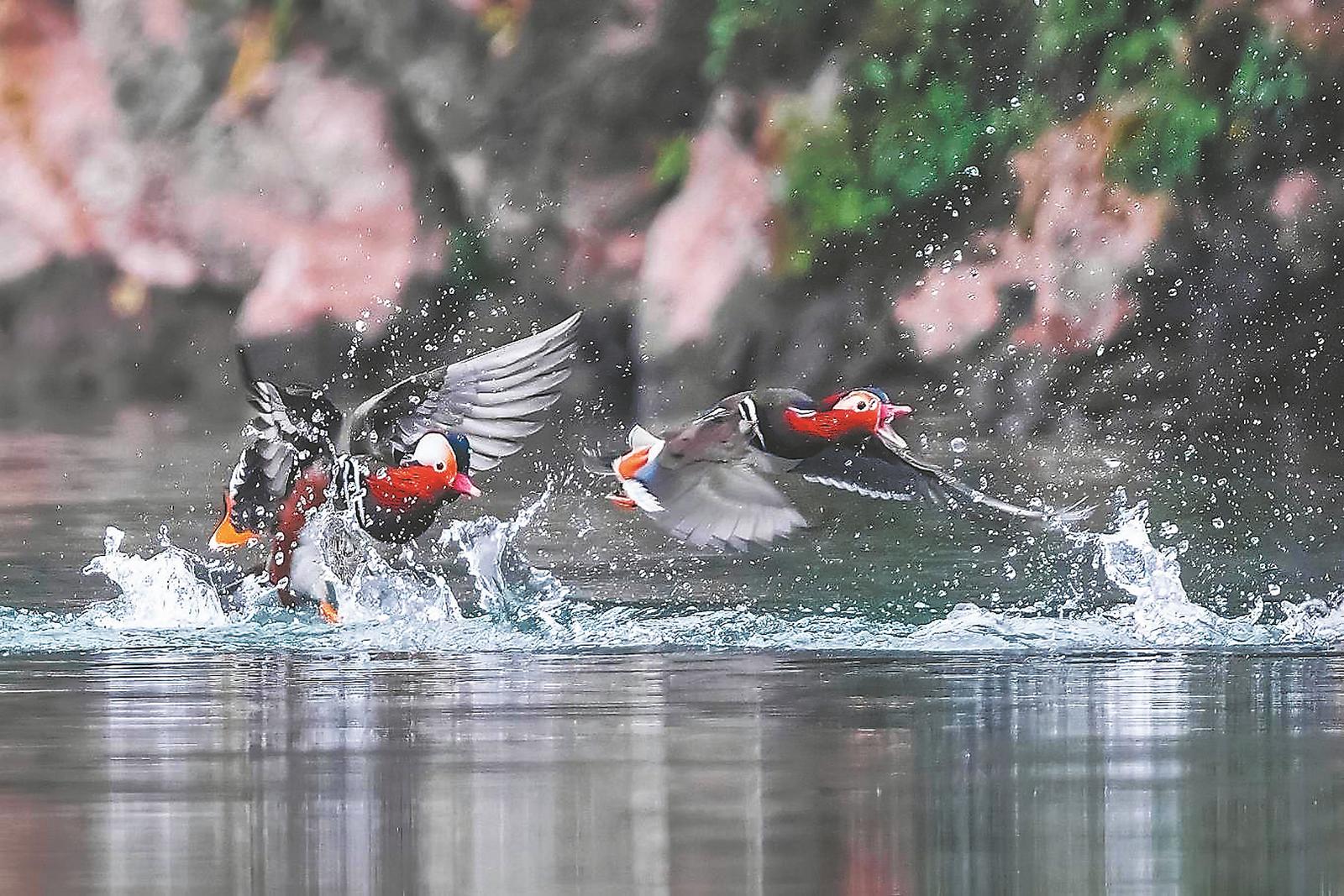 六安市霍山县单龙寺镇双龙村水域,成群鸳鸯嬉戏。