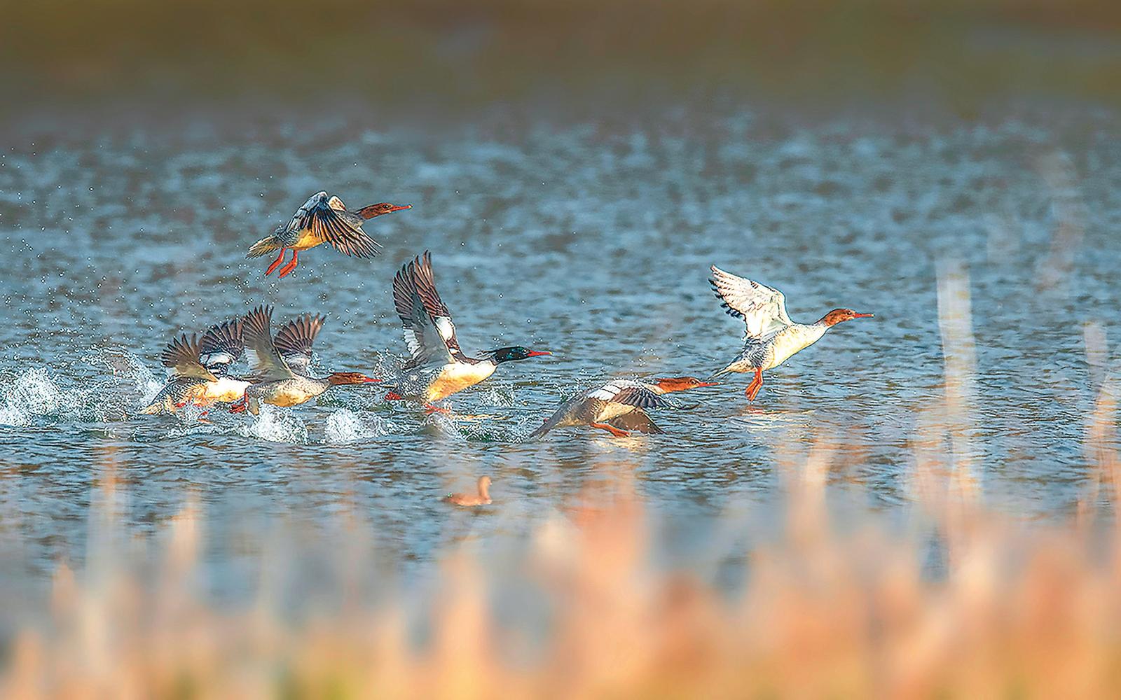 安庆市太湖县花亭湖是中华秋沙鸭的重要越冬地之一,珍稀鸟类在此嬉戏、觅食。