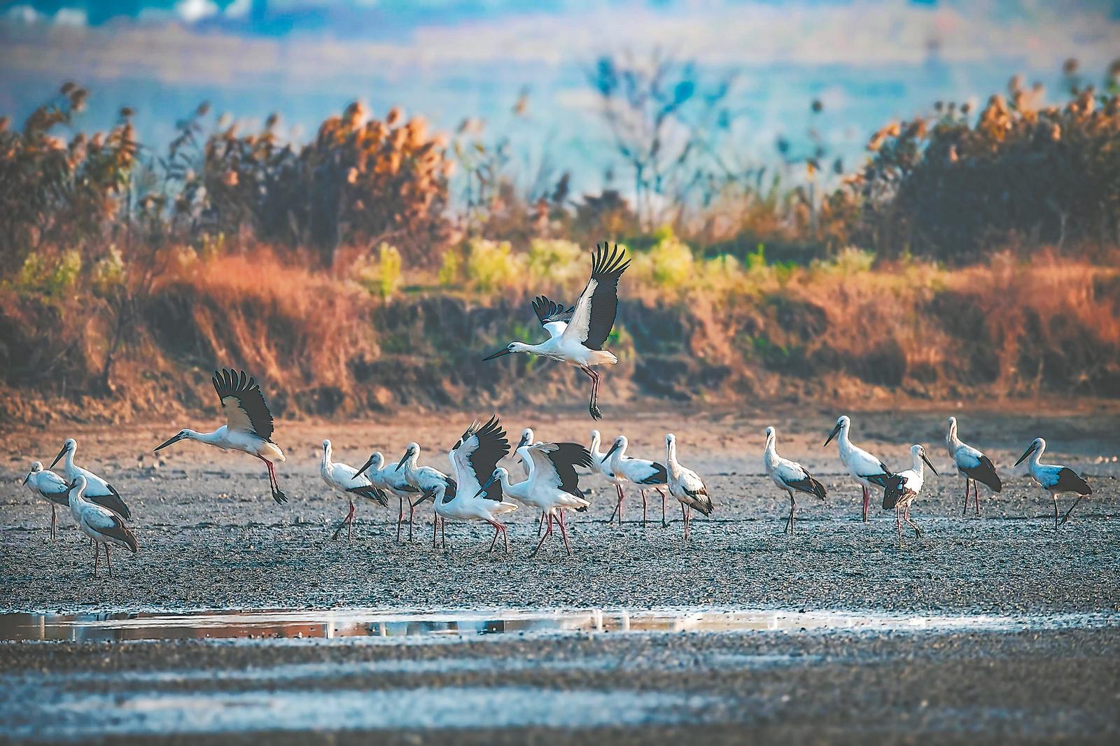 合肥市肥东县长临河镇附近的巢湖湿地是东方白鹳的重要栖息地。图为东方白鹳在湿地休憩。