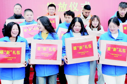 12月3日,六安开发区总工会在辖区新就业形态劳动者之家开展“暖‘新’更暖心 致敬城市奋斗者”新业态劳动者暖“新”礼包发放活动,首批50余名网约车司机、快递小哥等代表,通过“职工之家”APP核销流程后,愉快地接过装有被子、保温杯等物品的暖心礼包。