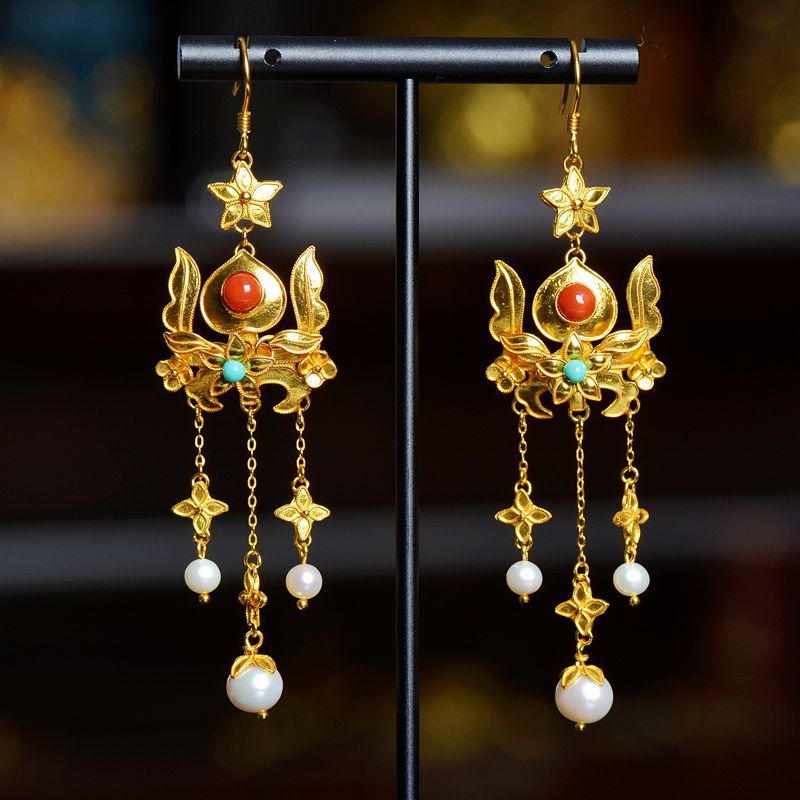 马赛制作的花丝镶嵌作品——桃枝耳坠。新华社发