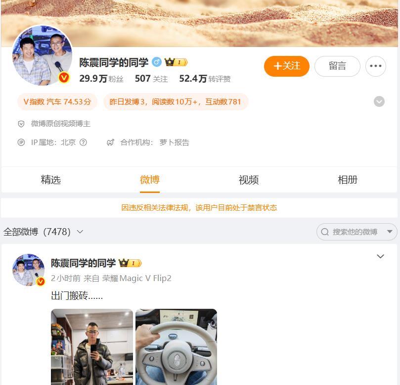 据此前报道,12月4日晚,极目新闻记者注意到,全网拥有2400多万粉丝的陈震多平台账号被禁言。