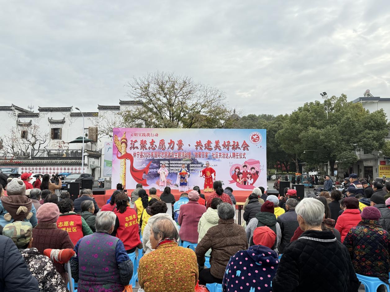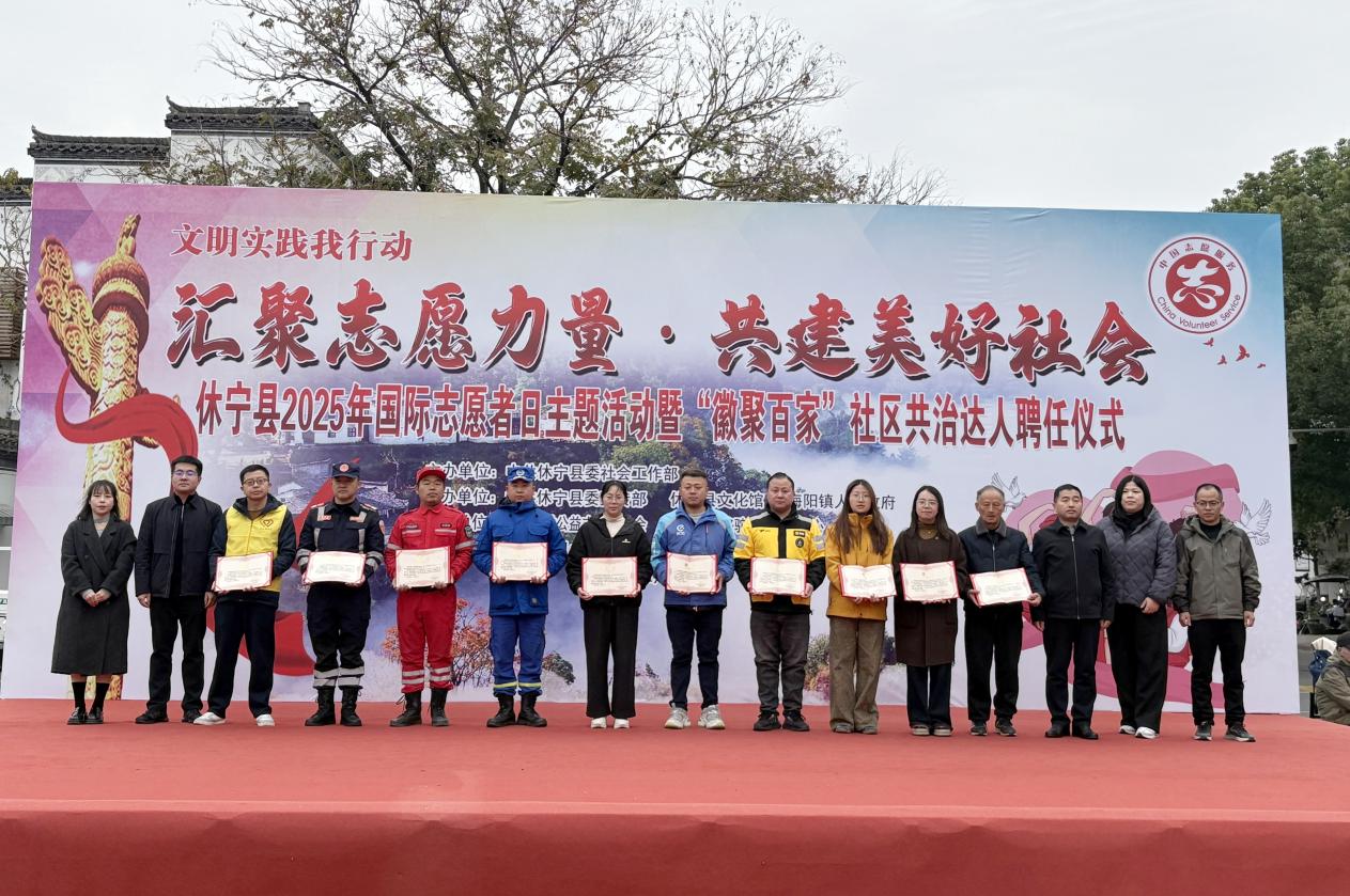 12月5日上午,以“汇聚志愿力量共建美好社会”为主题的休宁县2025年国际志愿者日主题活动暨“徽聚百家”社区共治达人聘任仪式在休宁县状元广场举行。活动由休宁县委社会工作部主办,休宁县委宣传部、休宁县文化馆、海阳镇人民政府协办,50余名志愿者齐聚一堂,为市民们送上冬日温情。